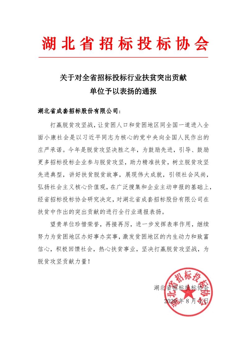 ? 近日,“湖北省招標(biāo)投標(biāo)行業(yè)扶貧突出貢獻(xiàn)單位”和“湖北省招標(biāo)投標(biāo)行業(yè)抗疫突出貢獻(xiàn)單位”兩個(gè)評選活動(dòng)落下帷幕,湖北省成套招標(biāo)股份有限公司在扶貧和抗疫工作中作出的突出貢獻(xiàn),得到了省招標(biāo)投標(biāo)協(xié)會(huì)的充分認(rèn)可,并在全行業(yè)進(jìn)行通報(bào)表揚(yáng)。