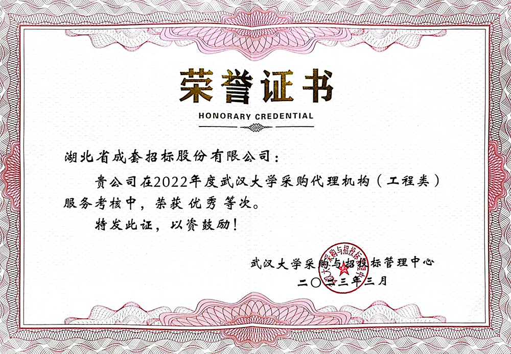 2022年,成套公司在武漢大學承擔的工程招標代理項目數(shù)量及質量均位居前列,順利完成該年度投資額最大的武漢大學電子信息學院教學樓建設項目的招標工作,贏得了學校的一致肯定及好評。同時,公司憑借過硬的專業(yè)水平,負責編制的招標文件在年度同類別招標項目中被武漢大學作為范本供其他代理機構學習使用。
