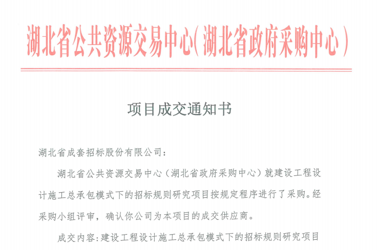 近日,成套公司順利承接湖北省公共資源交易中心(湖北省政府采購(gòu)中心)《建設(shè)工程設(shè)計(jì)施工總承包模式下的招標(biāo)規(guī)則研究項(xiàng)目》,體現(xiàn)了行業(yè)主管部門(mén)對(duì)公司技術(shù)實(shí)力的充分肯定和高度認(rèn)可。