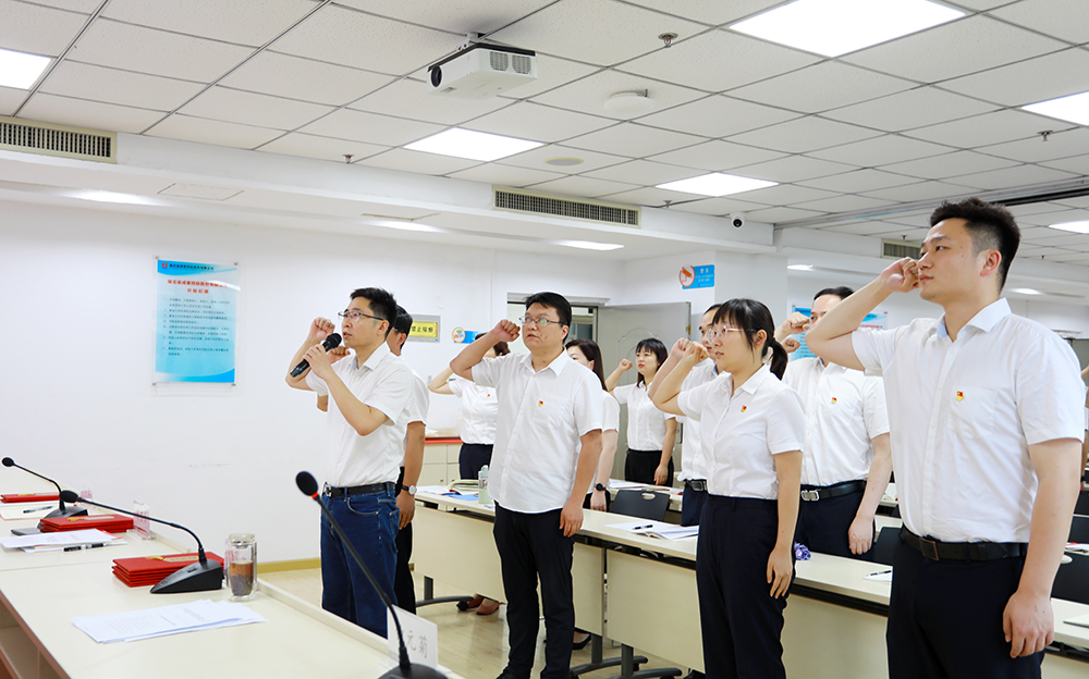 公司黨委書記、董事長項(xiàng)前帶領(lǐng)新黨員向黨旗莊嚴(yán)宣誓,全體與會黨員重溫入黨誓詞